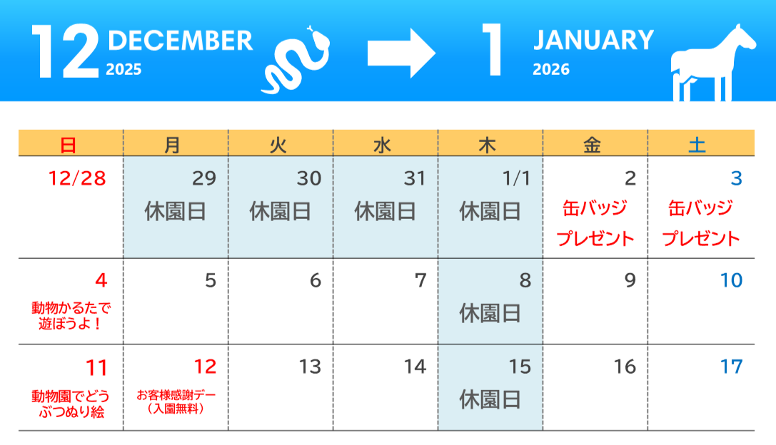 安佐動物公園は12/29(月)~1/1(木)の間休園いたします。年始は1/2(金)から開園いたします。