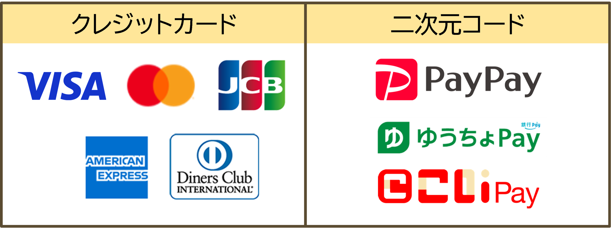 (Visa、Mastercard、JCB、アメリカン・エキスプレス、ダイナースクラブ)・二次元コード決済(PayPay、ゆうちょPay、こいPay)